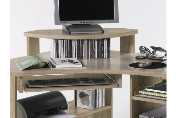 Rohový písací stôl s množstvom odkladacích priehradiek, ktoré poslúžia napríklad ako malá knižnica. Vyrobený v kombinácii dub sonoma/biela.
