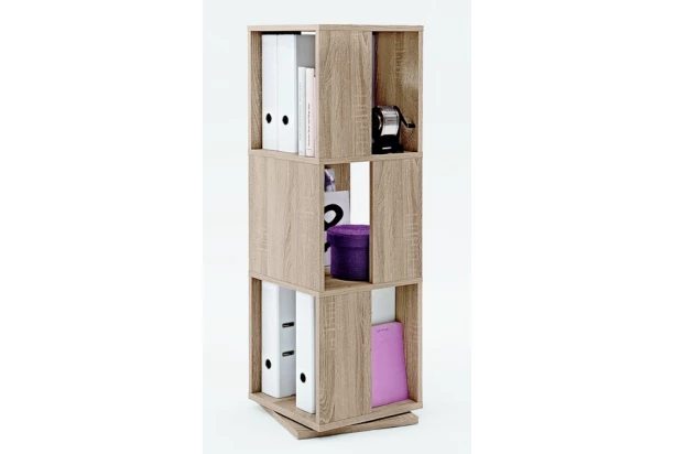 Zaujímavo riešený regál v dekore dub Sonoma má tri poschodia priehradok a jeho konštrukciu možno ľubovoľne otáčať.