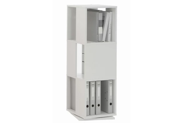 Zaujímavo riešený regál v bielej farbe má tri poschodia priehradok a jeho konštrukciu možno ľubovoľne otáčať.