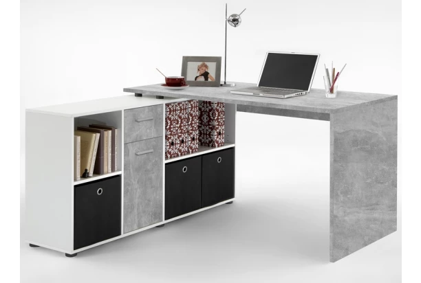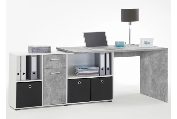 Veľmi praktický písací stôl s bočným úložným regálom pasuje takmer do každej miestnosti. Tento stôl ponúka možnosť univerzálneho zostavenia do štyroch rôznych polôh – ľahko si tak prispôsobíte pracovný priestor podľa vlastných predstáv alebo bytovej dispozície. Písací stôl je vyrobený v kombinácii imitácie sivý betón/biela. Priehradky regálu môžete ľahko doplniť úložnými boxmi alebo šanónmi, kam si budete všetko prehľadne ukladať.