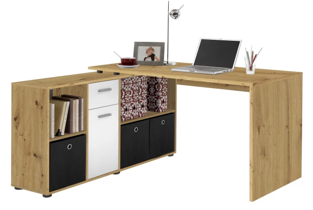 Veľmi praktický písací stôl s bočným úložným regálom sa hodí takmer do každej miestnosti. Tento stôl ponúka možnosť univerzálneho zostavenia do štyroch rôznych polôh – ľahko si tak prispôsobíte pracovný priestor podľa vlastných predstáv alebo bytovej dispozície. Písací stôl je vyrobený v kombinácii dub artisan/biela. Priehradky regálu môžete ľahko doplniť úložnými boxmi alebo šanónmi, kam si budete všetko prehľadne ukladať.