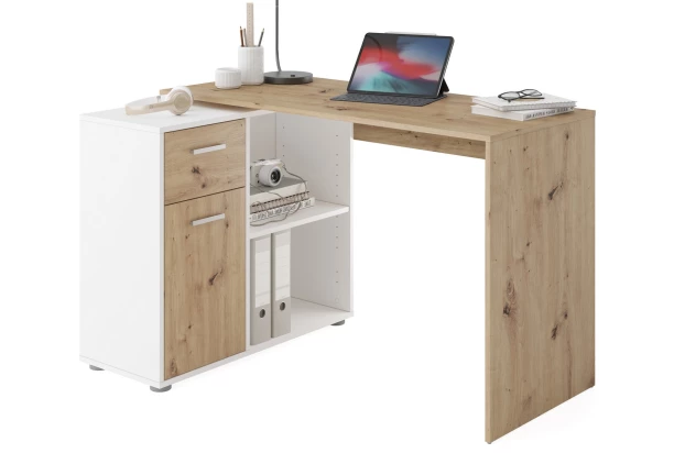Univerzálne zostaviteľný písací stôl sa ľahko prispôsobí Vašim priestorovým požiadavkám. Tento stôl je možné zostaviť celkom do štyroch rôznych polôh – ľahko ho teda umiestnite takmer do každej miestnosti. Vyrobený v kombinácii dekoru dub artisan/biela. Oceníte aj praktické úložné priestory v bočnom regáli, kde budete mať všetko vždy po ruke.