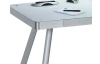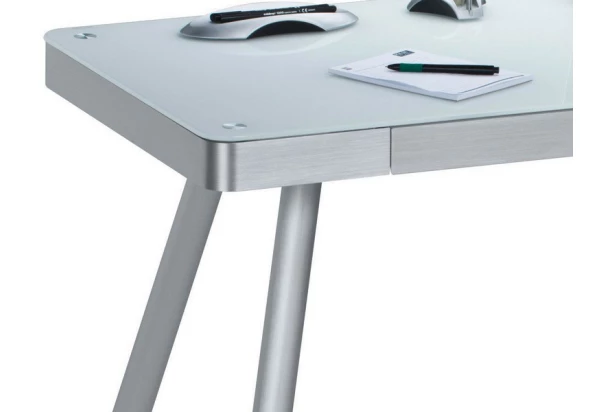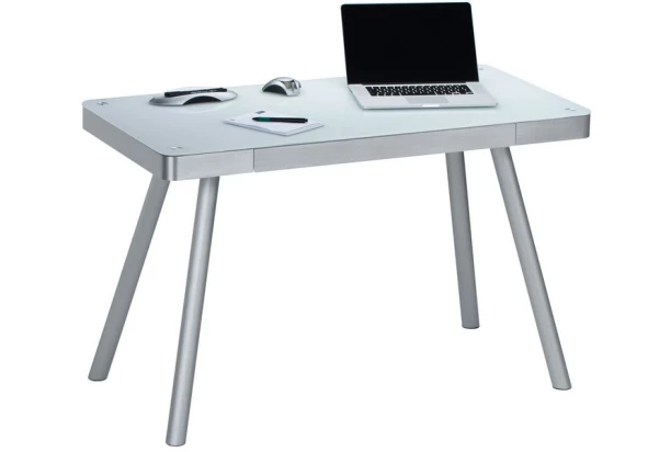 Štýlový písací stôl so zaoblenými hranami v kombinácii kovu a bieleho skla – je ideálny aj pre prácu na notebooku, ktorý potom ľahko môžete uschovať do zabudovanej zásuvky.