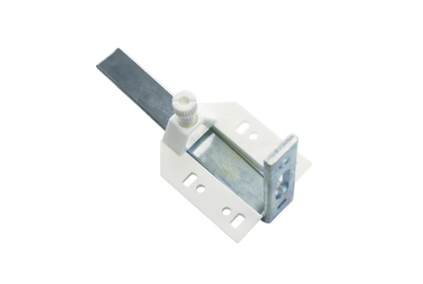 uhlový nosník (2 ks) s plastovým mostíkom a 90° kovovým uholníkom na montáž záclonových koľajničiek na stenu.