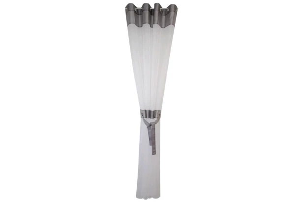 Transparentný záves z kvalitného materiálu biely so striebornými lemami uprostred a stuhou pre vytvorenie noblesnej atmosféry.