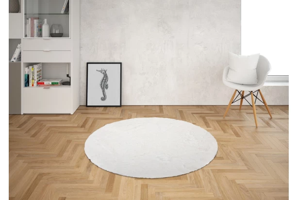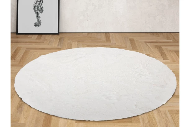 Moderný huňatý koberec v bielej farbe má vzhľad králičej kožušiny a je príjemný nielen na pohľad, ale aj na dotyk. Maznavý plyšový koberec si zamilujete pre jeho hebkosť a jemnosť, ktorý navyše krásne doplní a doladí Váš domov. Okrúhly koberec s priemerom 60 cm si tiež obľúbia deti vo svojej izbe.