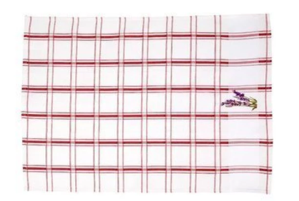 Bavlnená kuchynská utierka Lawenda v rozmere 45×65 cm. V červenej farbe s levanduľovou dekoráciou. Praktická v každej kuchyni, nevyhnutná na utieranie riadu.