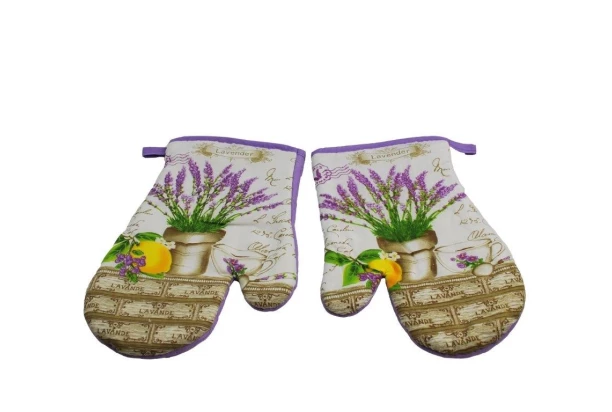 Kuchynská rukavica (chňapka) vo fialovo bielej farbe. Rukavica s praktickým pútkom. Ich veľkosť je 16×27 cm a sú vyrobené z 90% polyesteru a z 10% bavlny.