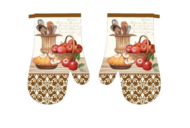 Kuchynská rukavica (chňapka) v béžovo hnedej farbe. Rukavica má praktické pútko. Ich veľkosť je 16×27 cm a sú vyrobené z 90% polyesteru a z 10% bavlny.