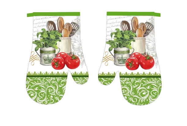 Kuchynská rukavica (chňapka) v zeleno bielej farbe. Rukavica má praktické pútko. Ich veľkosť je 16×27 cm a sú vyrobené z 90% polyesteru a z 10% bavlny.