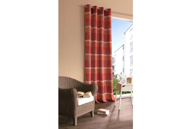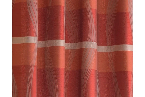 Nepriehľadný červený záves o rozmere 146×245 cm vyniká krásnou kombináciou vodorovných pruhov, ktoré sú prerušené jemným vlnitým motívom. Všetko je harmonicky zladené a záves tak pôsobí pokojne a elegantne.