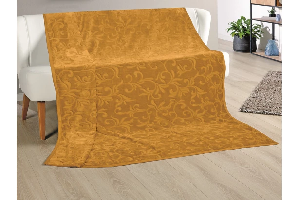 Príjemná flanelová deka XXL v horčicovej žltej farbe s motívom ornamentov Váš poteší počas relaxovania pri televízii alebo pri knižke. Ideálna aj ako prikrývka na spanie alebo ako dekoračná prikrývka. Rozmer 180×220 cm.