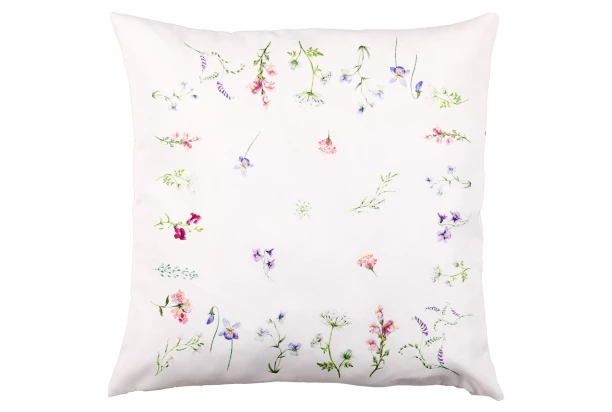 Dekoračný vankúš s výplňou skvele nielen doplní obývaciu izbu, ale aj spálňu. Biely vankúš s motívom lúčnych kvetov taktiež oceníte počas posedenia na terase, balkóne alebo záhrade. Zútulnite si Váš domov a užite si väčšie pohodlie. Rozmer 45×45 cm.
