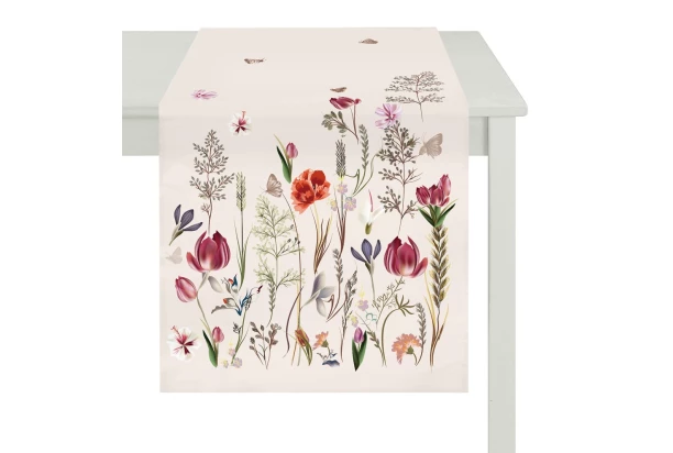 Oživte svoj stôl elegantným behúňom, ktorý na rozdiel od obrusu zakryje len prostrednú časť stolovej dosky. Krémový behúň s motívom kvetinovej lúky je nielen krásny, ale taktiež poskytne čiastočnú ochranu pred poškriabaním. Rozmer 40×150 cm.