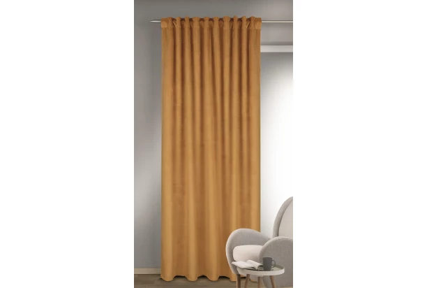 Zatemňovací záves v zamatovo hladkom vzhľade v jednofarebnom žltom prevedení, pôsobí luxusným a elegantným dojmom. Záves perfektne zatieni prenikajúce svetlo, poskytne súkromie a vytvorí útulnú atmosféru. Rozmer 135×245 cm.