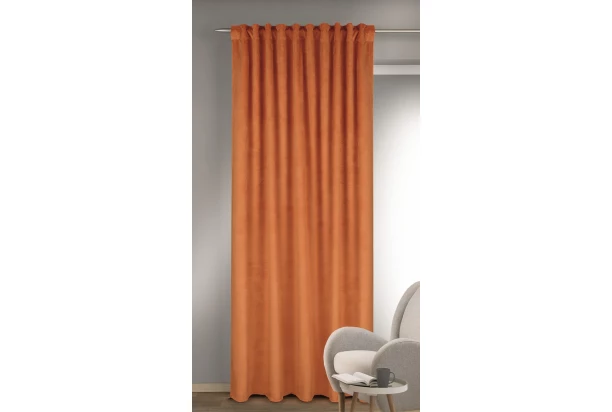 Zatemňovací záves v zamatovo hladkom vzhľade v jednofarebnom oranžovom prevedení pôsobí luxusným a elegantným dojmom. Záves perfektne zatieni prenikajúce svetlo, poskytne súkromie a vytvorí útulnú atmosféru. Rozmer 135×245 cm.