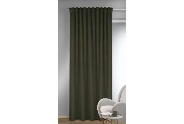 Zatemňovací záves v zamatovo hladkom vzhľade v jednofarebnom olivovo zelenom prevedení pôsobí luxusným a elegantným dojmom. Záves perfektne zatieni prenikajúce svetlo, poskytne súkromie a vytvorí útulnú atmosféru. Rozmer 135×245 cm.