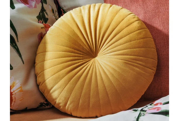 Okrúhly dekoračný vankúš vo svetlo oranžovej farbe dodá vašej pohovke nový šmrnc a väčšie pohodlie. Priemer 40 cm.