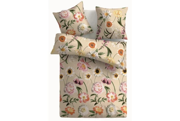 Bavlnené posteľné obliečky v béžovej farbe s elegantným motívom farebných kvetov rozžiaria každú spálňu a poskytnú pohodlný spánok.