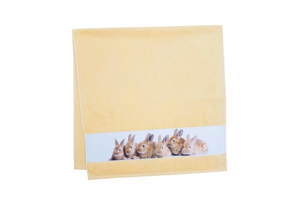 Detský uterák s roztomilým zvieracím motívom v žltej farbe si zamilujú dievčatá aj chlapci. Uterák s farebnou fotopotlačou králikov v úzkom bielom pruhu je vyrobený z bavlny a je utkaný do jemného Walk-froté s gramážou 410g/m². Rozmer 50×100 cm.