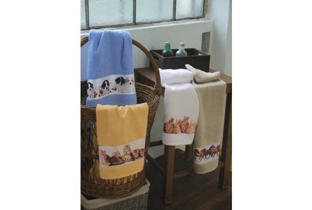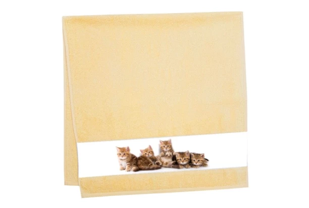 Detskú osušku s roztomilým zvieracím motívom v žltej farbe si zamilujú dievčatá aj chlapci. Detská osuška s farebnou fotopotlačou mačiatok v úzkom bielom pruhu je vyrobená z bavlny a je utkaná do jemného Walk-froté s gramážou 410g/m². Rozmer 75×150 cm.