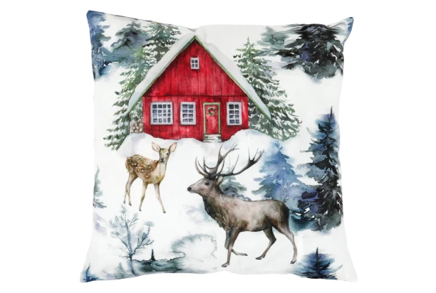 Dekoračný vankúš z príjemného zamatu je hladký a mäkký na dotyk. Vankúš so zimným motívom zasneženej chalúpky s jeleňom a srnkou na bielom pozadí poskytne pohodlie a dokonale ozdobí Váš domov počas Vianoc. Rozmer 45×45 cm.
