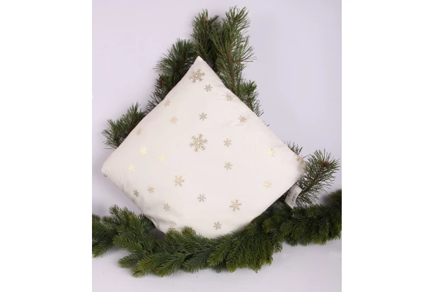 Dekoračný vankúš z príjemného zamatu je hladký a mäkký na dotyk. Vankúš so zimným motívom zlatých snehových vločiek na bielom pozadí poskytne pohodlie a dokonale ozdobí Váš domov nielen počas Vianoc. Rozmer 45×45 cm.