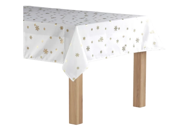 Elegantný biely obrus na stôl so zimným motívom zlatých snehových vločiek navodí v kuchyni či jedálni príjemnú sviatočnú atmosféru a pohodu nielen pri štedrovečernej večeri. Obrus je nielen krásny, ale aj praktický bytový doplnok, ktorý poskytne ochranu stola pred poškriabaním a ušpinením. Rozmer 160×130 cm.