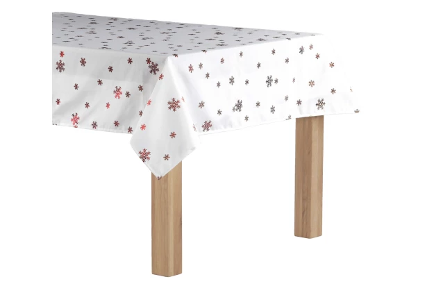 Elegantný biely obrus na stôl so zimným motívom červených snehových vločiek navodí v kuchyni či jedálni príjemnú sviatočnú atmosféru a pohodu nielen pri štedrovečernej večeri. Obrus je nielen krásny, ale aj praktický bytový doplnok, ktorý poskytne ochranu stola pred poškriabaním a ušpinením. Rozmer 160×130 cm.