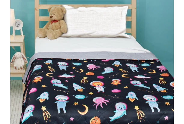 Detský prehoz na posteľ o rozmere 170×210 cm s motívom roztomilých zvieratiek vo vesmíre na čiernom podklade perfektne doladí dievčenskú aj chlapčenskú izbičku.