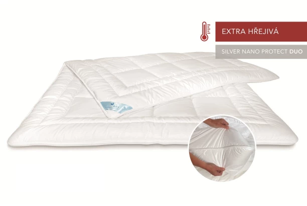 Extra hrejivá prikrývka DUO o rozmere 135×200 cm je opatrená náplňou z dvoch vrstiev HCS vlákien Loft oddelených vzduchovou medzerou. Jej konštrukčné riešenie je zamerané na získanie čo najvyšších tepelnoizolačných parametrov pri zachovaní príjemného designu. Optimálna hustota prešitia dáva vyniknúť náplni s vysokým objemom a vytvára nadýchaný a hrejivý vzhľad výrobku. Prikrývka zaistí kvalitný a zdravý spánok.