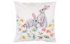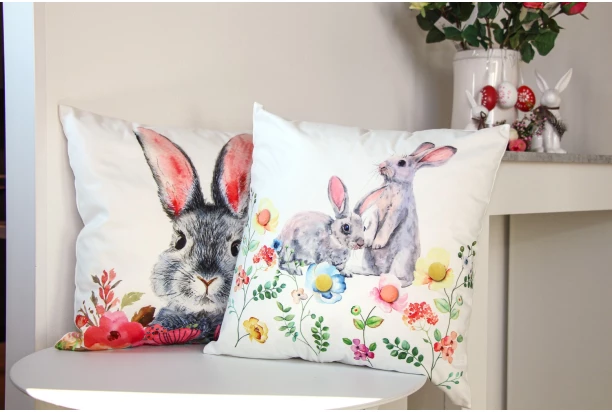 Dekoračná obliečka na vankúš s rozmerom 45×45 cm s veľkonočným motívom vykúzli krásnu sviatočnú atmosféru u Vás doma. Na povlaku sú roztomilí zajačikovia s kvetmi v akvarelovom prevedení. Ideálne ako jarný bytový doplnok.