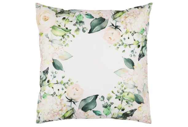 Zamatová dekoračná obliečka na vankúš o rozmere 45×45 cm s kvetinovým motívom bielych ruží a hortenzií. S týmto povlakom vnesiete do svojho domova jarnú náladu a pohodu.