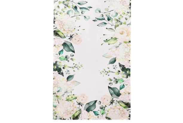 Behúň na stôl s kvetinovým motívom bielych ruží a hortenzií vnesie do Vášho domova jarnú náladu a pohodu. Behúň na rozdiel od obrusu zakryje len prostrednú časť stolovej dosky, ale aj tak poskytne čiastočnú ochranu stola pred poškriabaním a ušpinením. Rozmer 150×40 cm.