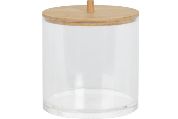 Kúpeľňový okrúhly organizér na kozmetiku a doplnky je vyrobený z plastu. Nádoba má navyše praktické bambusové veko s rukoväťou. Priemer 9,5 cm.