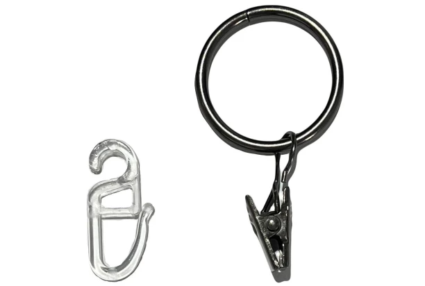 Sada (10 ks) krúžkov na garnižu so žabkou a zatváracím háčikom v prevedení čierny nikel. Určené pre záclonové tyče s priemerom 16 – 20 mm.