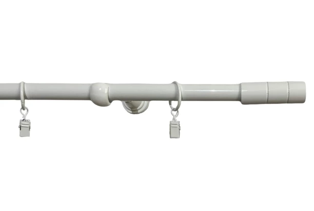 Kovová garniža v bielej lesklej farbe s dĺžkou 240 cm s valcovou koncovkou. Krúžky so žabkou, nosníky a montážny materiál sú súčasťou balenia.