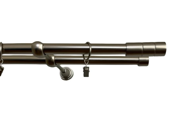 Kovová dvojradová garniža v prevedení strieborný satén s dĺžkou 240 cm s valcovou koncovkou. Krúžky so žabkou, nosníky a montážny materiál sú súčasťou dodávky.