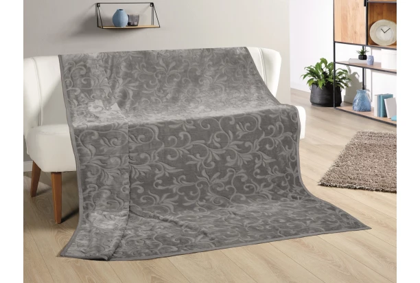 Príjemná deka v striebornej farbe s motívom ornamentov Vás poteší počas relaxovania pri televízii alebo pri knižke. Ideálna aj ako prikrývka na spanie alebo ako dekoračná prikrývka. Rozmer XXL 180×220 cm.