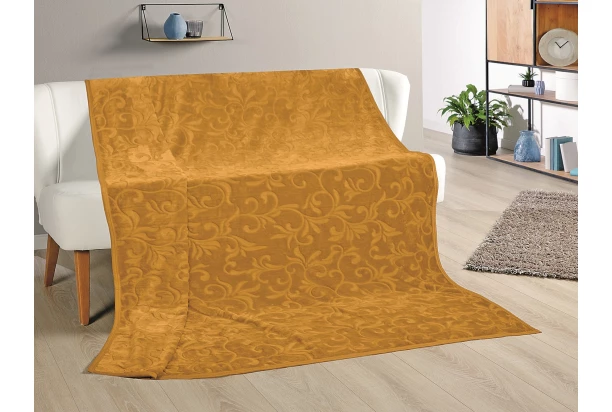 Príjemná deka v horčicovo žltej farbe s motívom ornamentov Vás poteší počas relaxovania pri televízii alebo pri knižke. Ideálna aj ako prikrývka na spanie alebo ako dekoračná prikrývka. Rozmer XXL 180×220 cm.
