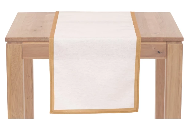 Krémový behúň na stôl s vtkanými zlatými nitkami a so zlatým lemom vykúzli sviatočnú atmosféru a zimnú pohodu nielen pri štedrovečernej večeri. Behúň na rozdiel od obrusu zakryje len prostrednú časť stolovej dosky, ale aj tak poskytne čiastočnú ochranu stola pred poškriabaním a ušpinením. Rozmer 150×40 cm.