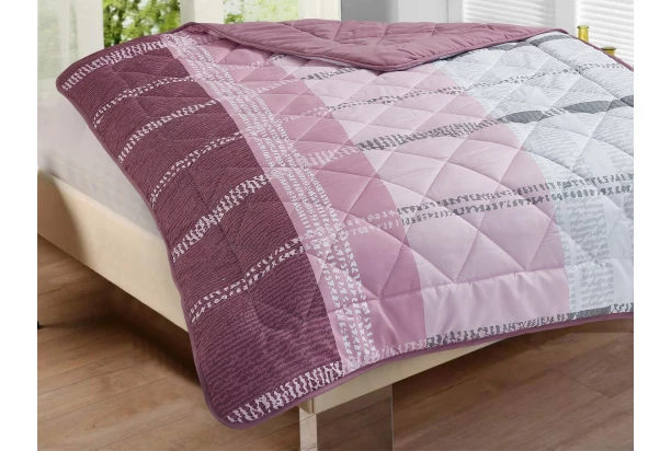 Ľahká a priedušná letná prikrývka je ideálna pre pohodlný spánok počas teplých nocí. Prikrývka má obojstranný dizajn v ružovej farbe – predná strana má moderný geometrický vzor, zadná strana je jednofarebná. Rozmer 140×200 cm.
