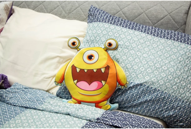 Vankúš v tvare príšerky v žltej farbe je roztomilý a veselý doplnok do detskej izby. Môže slúžiť ako pohodlný vankúš na spanie alebo ako hračka či dekorácia, ktorá poteší každé dieťa.
