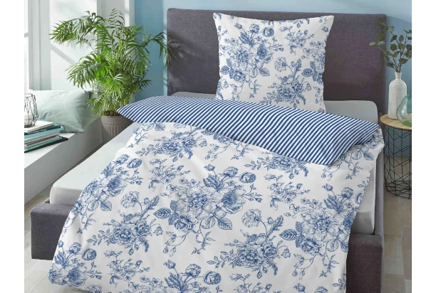Priedušné a odolné bavlnené renforcé posteľné obliečky okúzlia svojim elegantným vzhľadom v kvetinovom dizajne. Jeho harmonické farby prinášajú pocit pohodlia a pokoja. Okrem kvetinového motívu zaujmu aj pruhovanou obojstrannou stranou. Bavlna renforcé je špičkou v bavlnenom textile. Je jemnejšia, hebkejšia a príjemnejšia na dotyk, navyše má zvýšené absorpčné vlastnosti, odvádza vlhkosť, je odolnejšia voči oteru a má dlhšiu živostnosť. Farba biela/modrá.