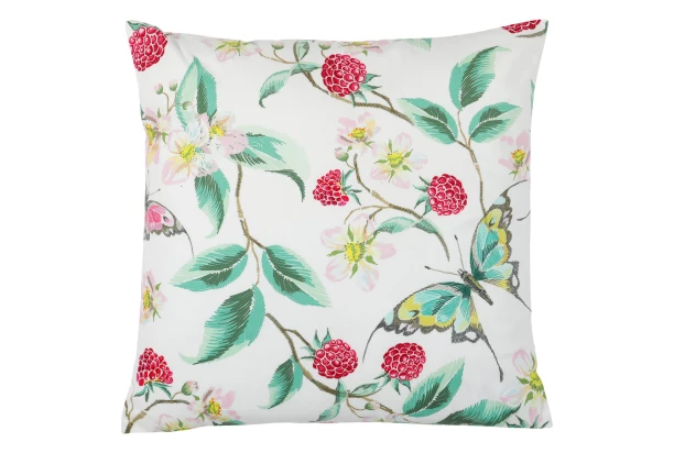 Elegantný dekoračný vankúš s rozmermi 45×45 cm s prírodným motívom prináša do vášho priestoru útulnosť, ale aj nádych letnej sviežosti. Zamatový povrch dotvára luxusný pocit pri dotyku. Na svetlom pozadí vynikne jeho farebný motív (vetvičky malín s červenými plodmi, biela kvietka, motýle) a stane sa neodolateľným estetickým doplnkom sedačiek, kresiel či pohoviek v obľúbenom priestore.