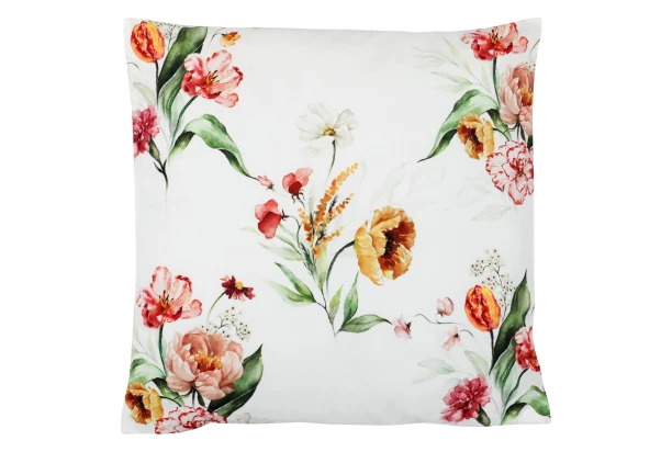 Elegantný dekoračný vankúš s rozmermi 45×45 cm s prírodným motívom prináša do vášho priestoru útulnosť, ale aj nádych letnej sviežosti. Zamatový povrch dotvára luxusný pocit pri dotyku. Na svetlom pozadí perfektne vynikne jeho farebný kvetinový motív a stane sa neodolateľným estetickým doplnkom sedačiek, kresiel či pohoviek v obľúbenom priestore.