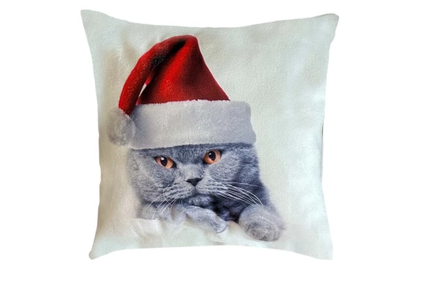 Malý vankúšik s rozmermi 25×25 cm s potlačou mačky v červenej Santa čiapku je skvelým doplnkom pre vianočnú atmosféru. Oživí pohovku, posteľ alebo detskú izbičku a poteší všetkých milovníkov mačiek.