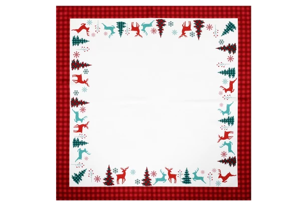 Štýlový vianočný obrus 80×80 cm vnesie do vášho domova kúzlo sviatkov. Farebné stromčeky a skákajúce soby, lemované tradičnou červenou kockou, navodia veselú atmosféru počas Vianoc. Hodí sa na stôl aj komodu a stane sa praktickým aj dekoratívnym doplnkom, ktorý doladí vašu vianočnú výzdobu.