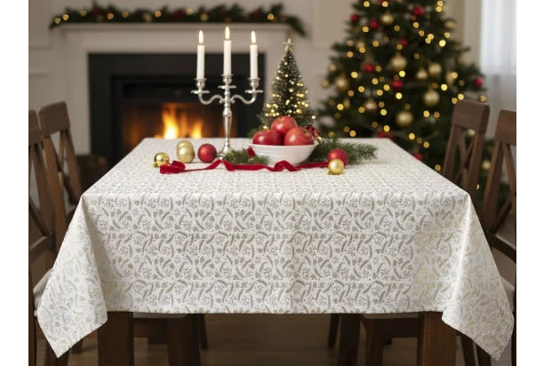 Vianočný dekoračný obrus 130×160 cm vnesie do Vášho domova kúzlo zimnej pohody a slávnostnej elegancie. Jemná kombinácia bielej farby so zlatým vianočným vzorom sa ľahko zladí s akýmkoľvek interiérom a vytvorí útulnú atmosféru.