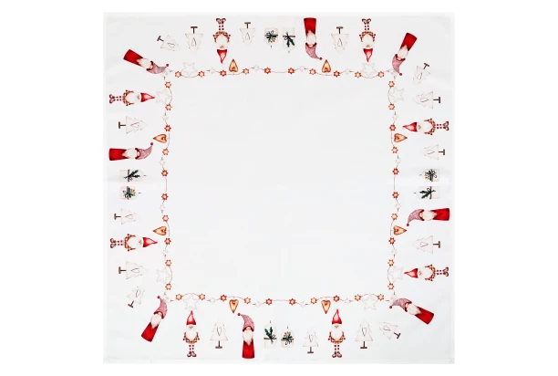 Vianočný obrus s roztomilými škriatkami s rozmerom 80×80 cm je skvelým doplnkom na stôl a stane sa tak praktickým aj dekoratívnym doplnkom, ktorý doladí vašu sviatočnú výzdobu. Svojím hravým motívom škriatkov v čiapkach s dlhými fúzmi vnesie do interiéru kúzelnú a útulnú atmosféru počas Vianoc.